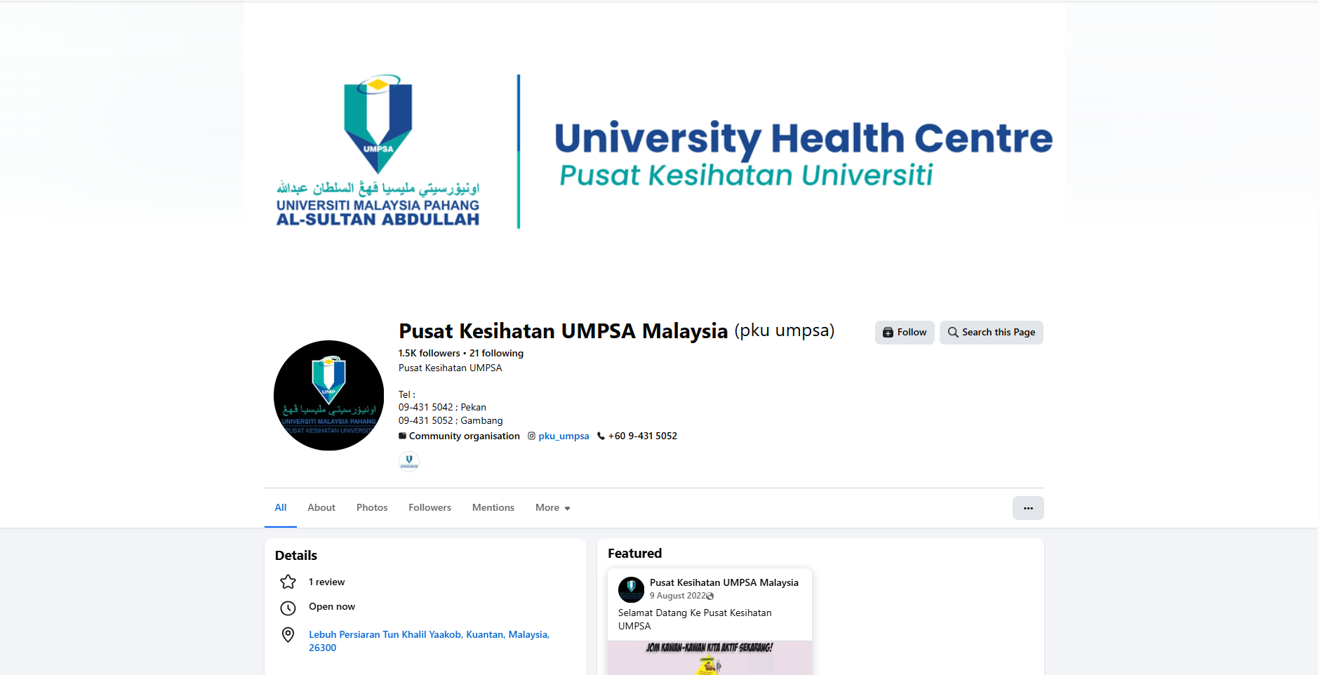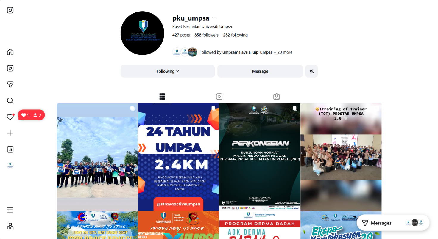 In addition to on-campus health services and activities, UMPSA also provides students and staff with health information and educational resources that can be accessed remotely. The University Health Centres (PKU) regularly disseminate updates, guidelines, and health awareness materials through the official UMPSA website, as well as social media platforms including Facebook and Instagram. These channels provide timely information on preventive care, healthy lifestyle tips, mental health awareness, dental care guidance, and COVID-19 or other public health updates, making it easier for the campus community to stay informed and adopt healthier practices, even remotely.