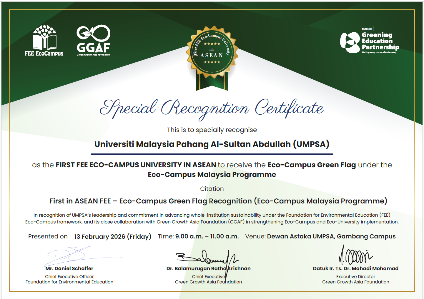 UMPSA’s Sustainability Achievement: Awarded EcoCampus Green Flag