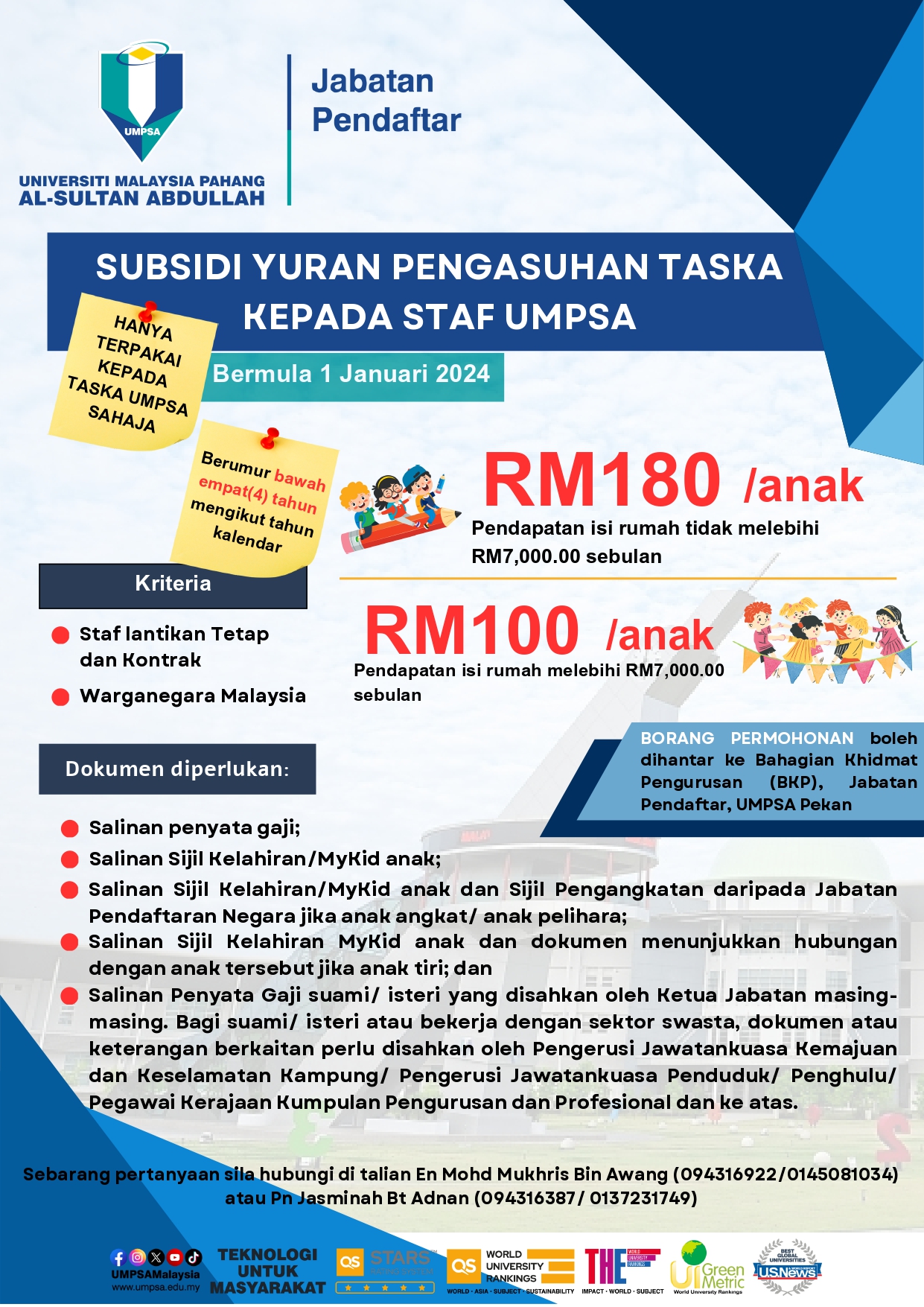 The centre provides a safe, nurturing, and family-friendly environment, offering reliable childcare services to support working parents, students, and community members. Through this initiative, UMPSA aims to facilitate work–life balance, promote early childhood development, and ensure the well-being of children within the campus and surrounding community.