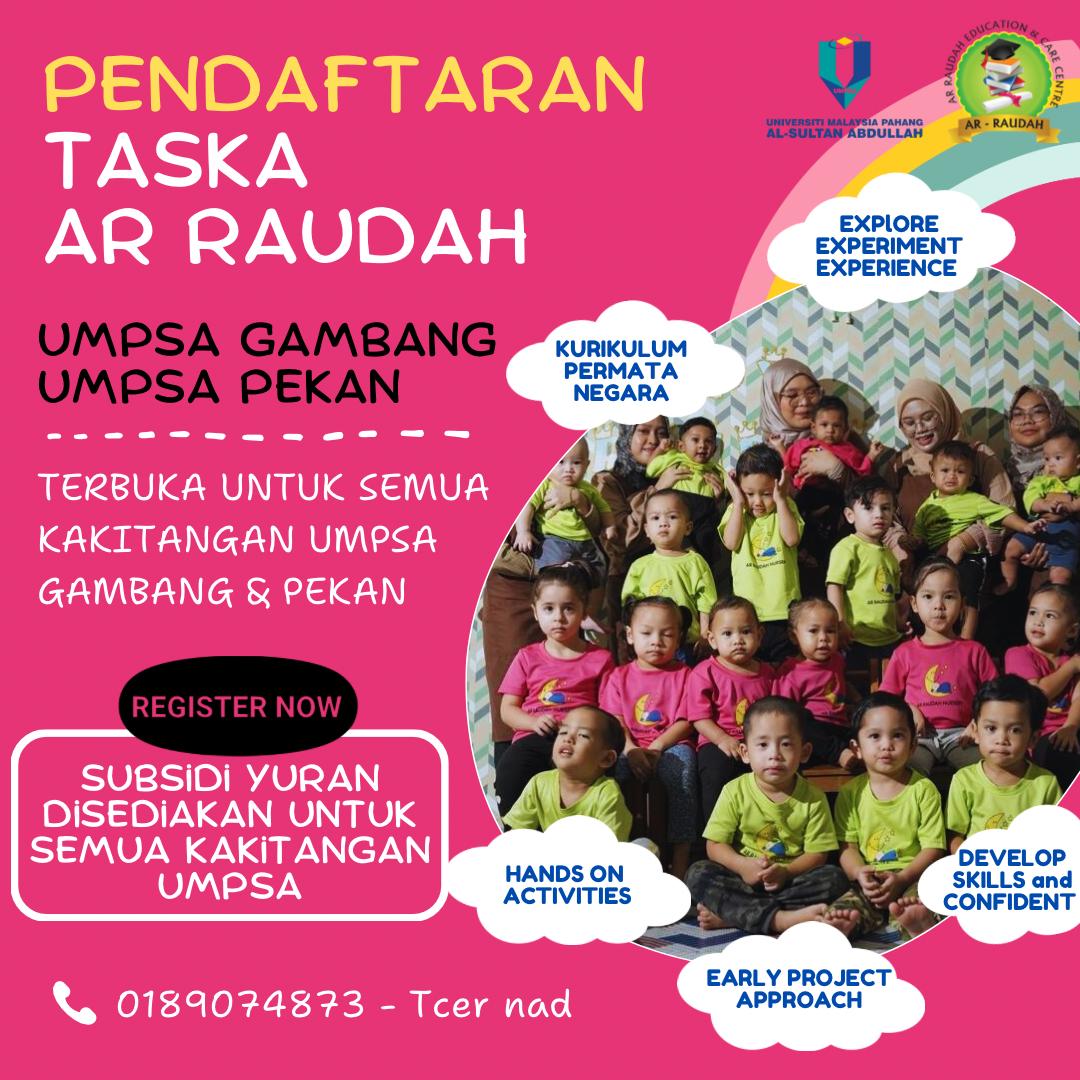 Universiti Malaysia Pahang Al‑Sultan Abdullah (UMPSA) Taska Ar Raudah is fully operational and open to staff, students, and the local community.