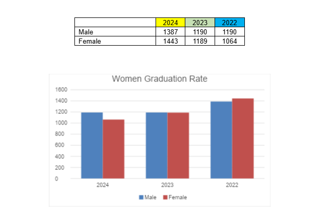 UMPSA systematically tracks and analyses women’s graduation rates as part of its commitment to gender equality and inclusive education. The university measures and monitors the likelihood of women graduating compared to men, enabling the identification of any disparities in academic progression or completion.
