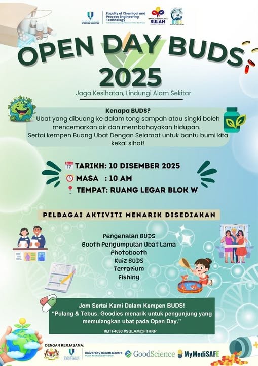 Designated collection points are provided on campus, allowing students and staff to safely return unused medicines. The collected pharmaceuticals are managed in accordance with national medical waste disposal guidelines. The initiative also includes awareness campaigns on responsible medicine use, safe storage, and the environmental risks of improper disposal. Through this program, UMPSA promotes responsible waste management practices while supporting environmental sustainability and community health.