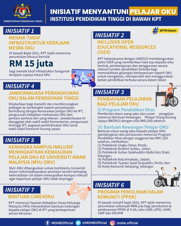The Persons with Disabilities Sponsorship System (SisPO) provides a structured platform for eligible students to apply for financial and educational support tailored to their specific needs. The financial assistance under BKOKU is designed to alleviate the economic burden of students with disabilities, covering essential educational costs such as tuition, learning materials, and adaptive equipment. Meanwhile, the Special Education Programme offers additional academic support, including personalized learning plans, mentorship, and access to inclusive learning facilities, ensuring that PWD students can participate fully in their academic programmes.