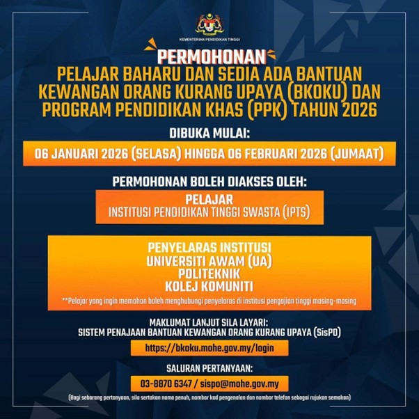 Financial Assistance for Persons with Disabilities (BKOKU) and the Special Education Programme (PPK) for new and continuing students via the Persons with Disabilities Sponsorship System (SisPO) for the year 2026.